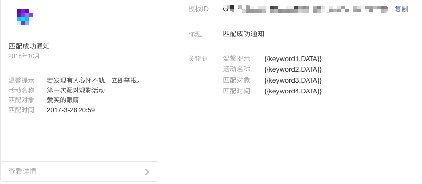 完成申请操作后,在微信公众平台可看到 模版消息id 、标题、所选的关键词列表及一个推送事例。