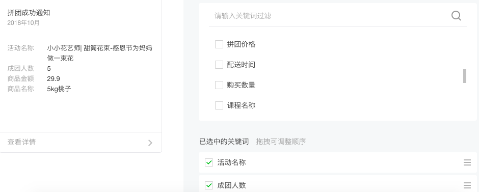 登陆微信公众号平台去模版库找到合适模版进行申请添加,选择模版可过滤不需要的关键词,过滤后可拖动所选关键词排序(最多可选10个关键词,最好保持5个左右,让用户感知更好的消息通知体验)当申请后配置提交后关键词种类和顺序将不能修改。